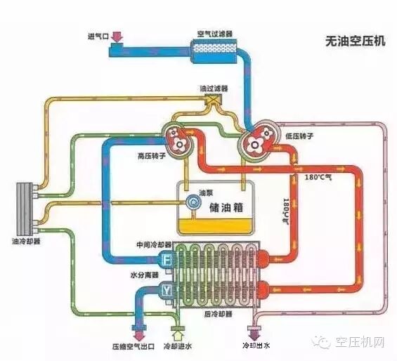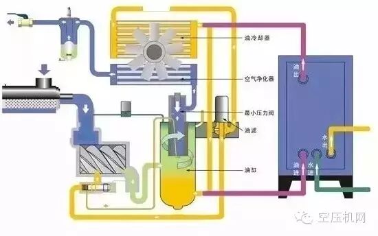 螺杆式空压机长期连续的运行过程中,把电能转换为机械能,机械能转换为热能,在机械能转换为热能过程中,空气得到强烈的高压压缩使之温度骤升,这是普通物理学机械能量转换现象。机械螺杆的高速旋转,同时也摩擦发热,这些产生的高热由空压机润滑油的加入混合成油/气蒸汽排出机体,这部分高温油/气流的热量相当于空压机输入功率的1/4,它的温度通常在80℃(冬季)-100℃(夏秋季),这些热能都由于机器运行温度的要求,被无端地废弃排往大气中,即空压机的散热系统来完成机器运行的温度要求。