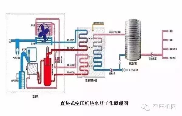 空压机热能热水机组,是一种利用压缩机高温油气热能,通过热交换将热能充分利用的节能设备。它通过能量交换和节能控制,收集空压机运行过程中产生的热能,同时改善空压机的运行工况,是一种相对高效废热利用、零成本运行的节能设备。